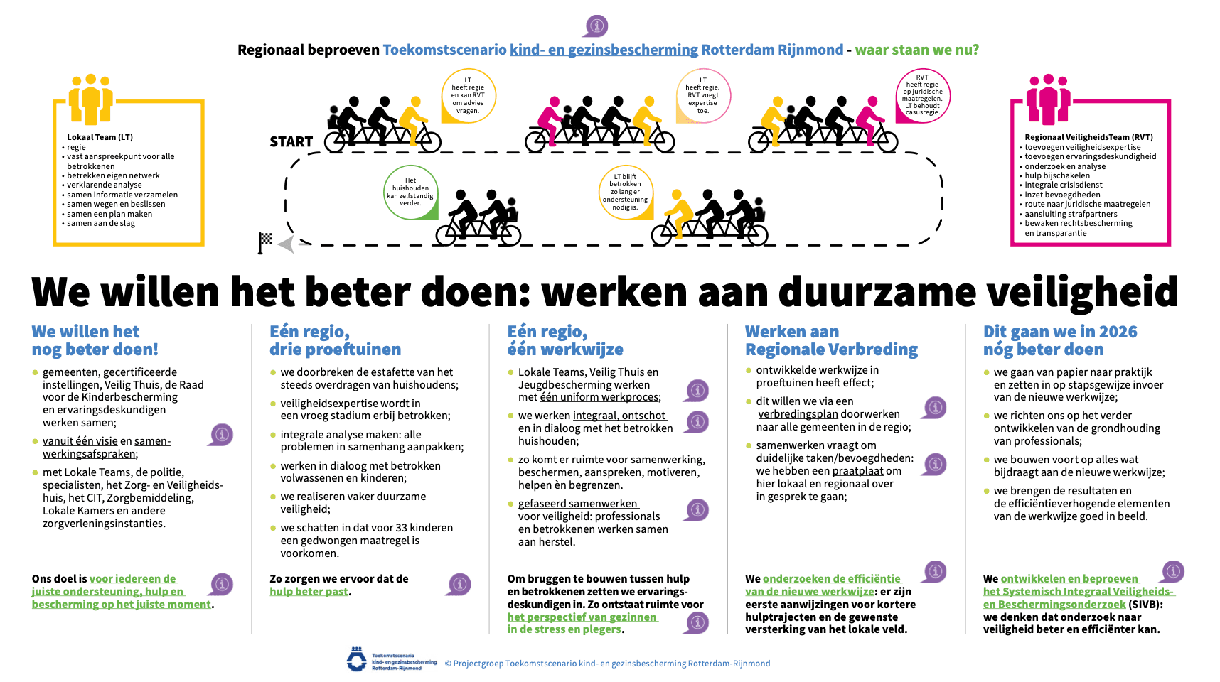 Het doel van de samenwerking tussen professionals, gemeenten, rijk, cliënten- en jeugdhulporganisaties is betere en tijdige hulp en ondersteuning voor de jeugd en hun gezin, op de juiste plek en wanneer dit nodig is. We bieden die hulp en ondersteuning binnen een stelsel dat duurzaam financieel houdbaar is. Niet vanachter een bureau, maar in de lokale praktijk.